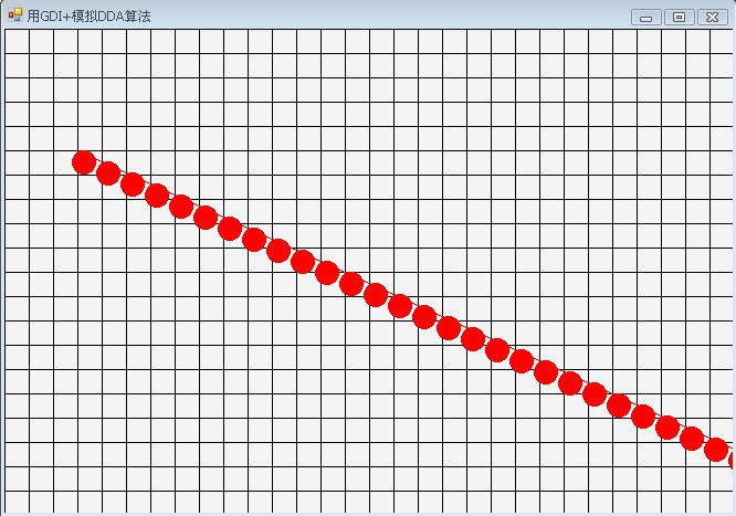 void MyDrawLine(Graphics gra, float startX, float startY, float endX, float endY) { float dx = endX - startX; float dy = endY - startY; float delta = dy / dx; float y = startY; for (int x = (int) startX; x <= endX; x++, y += delta) { DrawEllipseByCenter(gra, Pens.Red, x * pointSize, y * pointSize, pointSize * 0.5f); } }