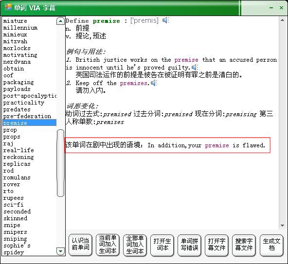 - 显示单词解释的同时显示其在剧中出现的语境,关键单词红色显示。效果如下: