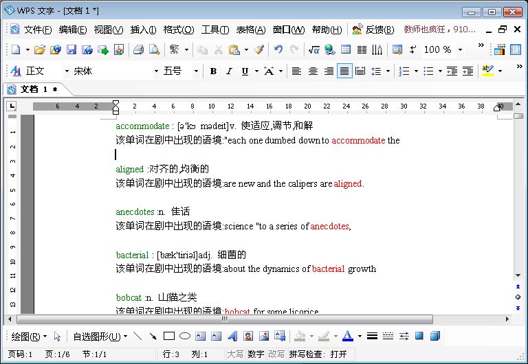 - 导出文档。可以把列表中的单词,其简明解释和在剧中出现的语境保存到文档中。关键词开头绿色显示,例句中红色显示。效果如下: