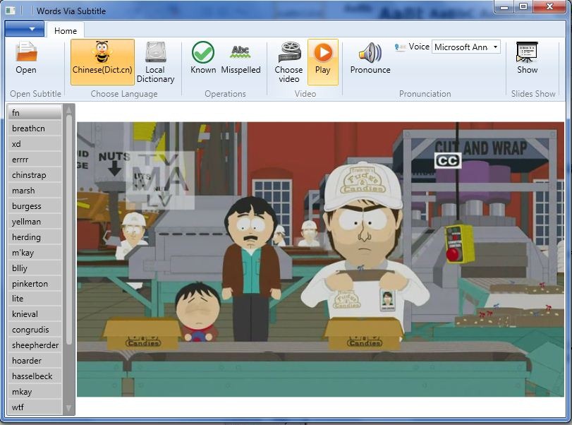 示一个单词及其解释,然后用机器发音读该单词,然后播放该单词在剧中出现的句子,然后切换到下一个生词再重复这一过程。