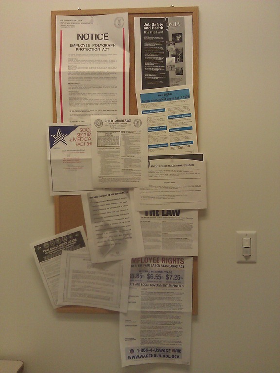 休息室的墙上贴了一堆妇女儿童保护条例之类的东西